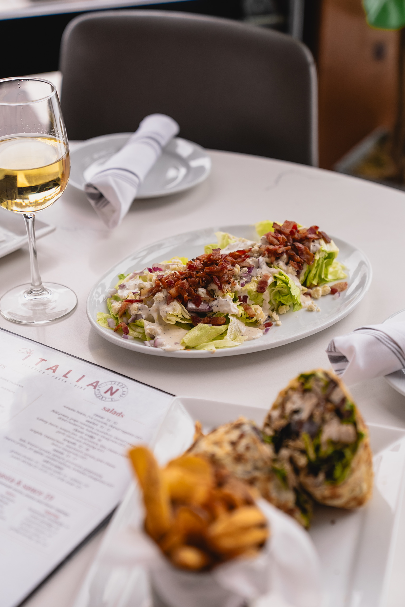 Iceberg, bacon, tomato jam, diced onions, bleu cheese crumble, garlic parmesan dressing